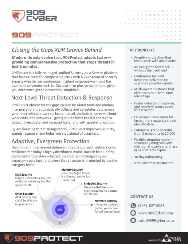 909Protect is a fully managed, unified Security-as-a-Service platform designed to close the critical gaps left by traditional XDR tools. It combines a curated, evergreen security stack with 24×7×365 security operations and continuous incident response—delivering enterprise-grade protection for organizations of any size.