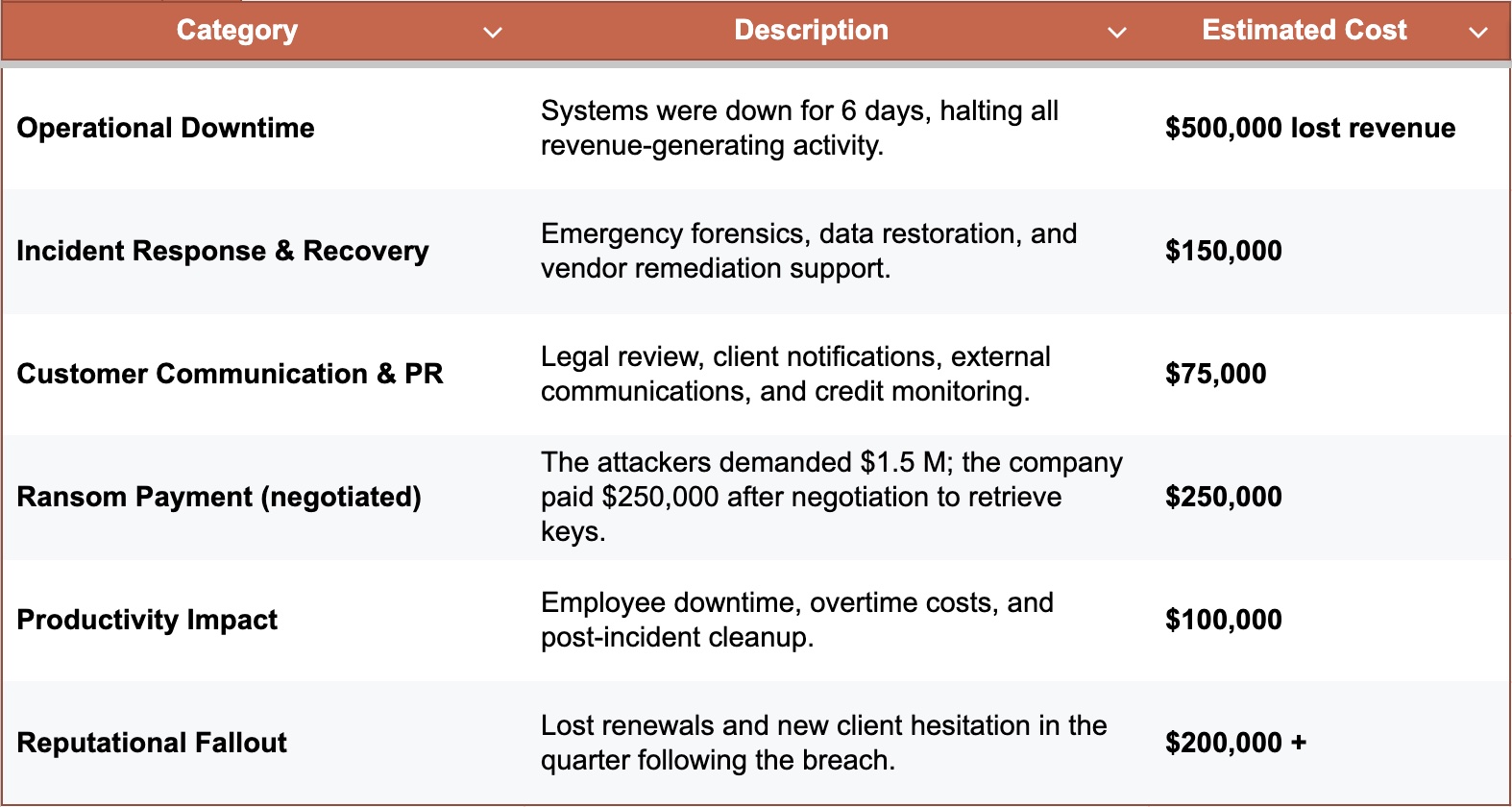 If those measures had been in place, total financial impact could have dropped by 70–80 %, limiting losses to well under $300,000 and preserving client trust.